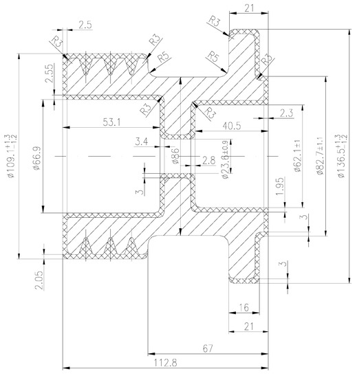From the literature review (Section 1), it results that determining the depth of cut is done by machining parameters optimization, considering an economic criterion. The analyzed optimization mathematical models do not include the relationship between the depth of cut and the surface integrity. This aspect might lead to objective function optimization but does not guarantee to obtain the desired machined-surface quality. In the case of Figure 5, the dimension that must be obtained is ϕ105 (external front face), having the roughness Ra = 25 µm and L = 54 mm. CDFTCI software has determined the technological sequence—rough-facing turning with the total depth of cut = 2.5 mm divided into two passes (n = 2). The first pass is made with a depth of cut of 1 mm, and the second one is made with a depth of cut of 1.5 mm. The total depth of cut is determined by considering the surface integrity in accordance with Formula (6). In the case of Figure 6, the dimension that must be obtained is ϕ72+0.074 (internal front face), having the roughness Ra = 3.2 µm and L = 54 mm. CDFTCI software has determined three technological sequences with depths of cut of 2.1 mm, 0.7 mm, and 0.6 mm, respectively. Rough turning is made by two passes with the depths of cut of 0.9 mm and 1.2 mm, respectively. The depths of cut are also determined by considering the surfaces integrity, in accordance with Formulas (6), (11), and (16). We mention that all these calculations are made by the CDFTCI software tool. The division of the depth of cut into two passes helps the tool protection. The results supplied by the CDFTCI software tool are found on the billet drawing (Figure 7); thus: 53.1 = 54 + 2.5 − 3.4. Final surface integrity is obtained by the process of successive transformations of the previous surface integrity into the current surface integrity, in accordance with Figure 1 and Formula (1). The industrial practice has confirmed the dependence of the components of surface integrity on the geometric features of the part and billet. This finding has allowed the determination of the mathematical models (2)–(16). The semi-finishing technological sequence might be excluded, but, in this case, the depths of cut for rough machining must increase.