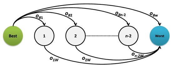 Similarly, in Equation (10), the preferences for all criteria and the worst criterion are compared pairwise, and the results are presented in the others-to-worst () vector as follows: