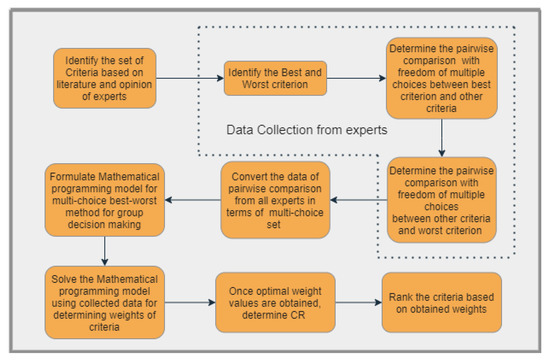 Step 5. Combine all experts’ pairwise comparison values for the most important criterion over all other criteria when making decisions in groups using a multichoice approach, i.e., MCBWM. Then, the best-to-others () vector consists of experts’ comparison values as choices, as shown in Equation (9) as: