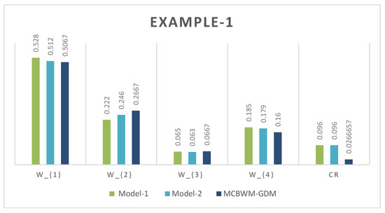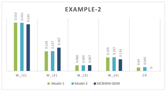In Table 6, the orders of the ranks obtained from the proposed model and by the method of Safarzadeh et al. [36] for the criteria are the same, i.e., . There is a slight difference in the criteria weights. The CR obtained using the developed approach is 0, which is far better than that of Safarzadeh et al. [36] approach, i.e., 0.040 and 0.045 for Models 1 and 2, respectively. The optimal weights, ordering, and CR of the criteria for Example 2 are presented in Figure 4.