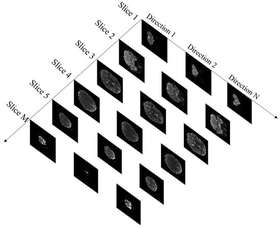 DWI [] is currently the only non-invasive method to observe the movement of water molecules inside living tissues. DWI images have diffusion gradient fields in six or more directions to obtain the fibre orientation of an organ under different diffusion gradient fields, derived from two-dimensional cross-sections of multiple faults under different dispersion gradient directions. A DWI image can be represented as and is a piece of four-dimensional data. The first two dimensions represent organ cross-sections, the third dimension s indicates the tomograph, and the fourth dimension d indicates the direction of the dispersion gradient. As shown in the Figure 1, N denotes the number of diffuse gradient directions, and M denotes the number of two-dimensional cross-sections.