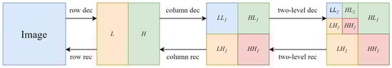 The Haar wavelet [] is the simplest discrete wavelet transform and is the foundation for other wavelet transforms. Compared to other discrete wavelet transforms, the Haar wavelet has lower computational complexity, making it suitable for applications with high computational requirements. The first-level decomposition of the Haar wavelet divides an matrix into four sub-matrices of size , representing the low-frequency information that preserves the cover image content, the vertical high-frequency information , horizontal high-frequency information , and diagonal high-frequency information . Based on the first-level decomposition, the low-frequency information can be used as the input for the next level of decomposition, resulting in four sub-matrices , , , and . The second-level decomposition and reconstruction process of the Haar wavelet for a 2D image is illustrated in Figure 2. For an -sized image I, the decomposition formula for the Haar wavelet can be expressed as follows: