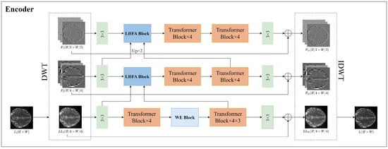 The above robust watermarking algorithms based on deep learning perform watermark embedding in the spatial domain. However, since DWI images contain rich texture and greyscale information, to preserve their texture details and fibre direction, a two-dimensional discrete wavelet transform (DWT) is adopted to decompose the DWI image into its corresponding frequency components. It performs watermark embedding in the low-frequency part of the DWI image in the wavelet domain. Discrete wavelet transform can decompose the cover image into different spatial and temporal scales and obtain its corresponding frequency components, effectively performing various image processing tasks. Nowadays, discrete wavelet transform is widely used in various computer vision tasks in deep learning research, such as super-resolution reconstruction, style transfer, and quality enhancement. Unlike the literature that directly passes all wavelet frequency information in the image to convolutional layers, the algorithm proposed in this section independently designs network branches for each group of frequency information. It combines the features of other branches to achieve a better reconstruction performance.