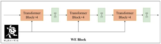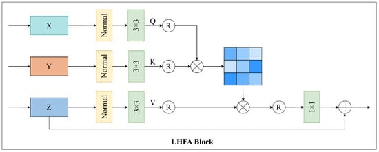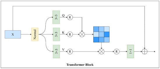 Thirdly, similar to the second stage, the high-frequency information and its corresponding reconstructed from the two-level wavelet decomposition are used as Q and K, respectively. The high-frequency information part from the first-level wavelet decomposition is used as V. The frequency information processed by the LHFA block is then passed through a Transformer block and convolution and then added to the content of the frequency band to obtain the reconstructed frequency band . Finally, the reconstructed three frequency bands, , , and , are subjected to a second-level discrete wavelet inverse transform to obtain the watermarked reconstructed image . The Transformer block in the network uses a self-attention module [] as shown in Figure 7.