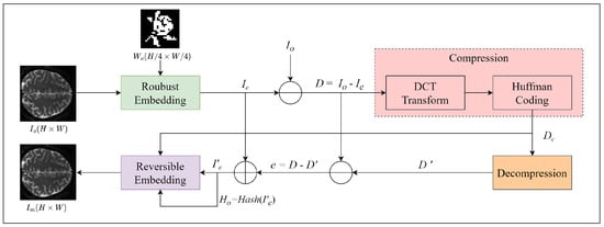 In medical diagnostics, applying digital watermarking techniques for copyright protection requires meeting specific requirements, including ensuring the integrity of medical image data and the robustness of the watermark. Traditional robust watermarking algorithms [,,] can correctly extract watermarked information for copyright authentication under various types of image attacks, but they inevitably cause distortion loss to the cover image. Reversible watermarking algorithms [,,], on the other hand, focus on lossless embedding and extraction of watermarked information, but they exhibit weaker resistance to attacks and are susceptible to common attack methods. Vulnerable watermarking [] is capable of tamper detection and localization for protected images, but cannot extract watermarked information for copyright authentication when under attack. For medical images, the distortion caused by robust watermarking methods, the vulnerability of reversible watermarking to various attacks and the low robustness of vulnerable watermarking are unacceptable. This has prompted researchers to develop a new watermarking method that combines robustness and reversibility.