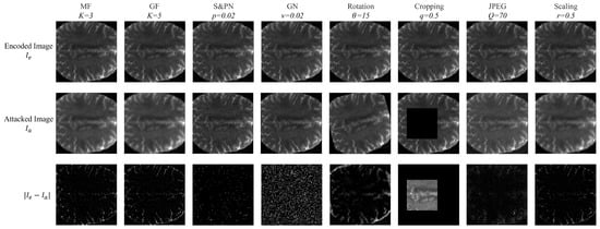 The common types of image attacks mainly contain median filtering and Gaussian filtering with convolution kernel size K of , , , SPN with a noise density p of 0.01, 0.02, and 0.03, Gaussian noise with a variance v of 0.001, 002, and 003, and JPEG compression with a quality factor Q of 90, 70, 30, and 10. The above attacks were applied to the slice images in each gradient direction of the DWI, and the watermark extraction BER values are shown in Table 3. It can be seen that almost all values of BER are equal to 0 after the images are subjected to conventional attacks, indicating that our proposed algorithm has excellent robustness against common attacks.