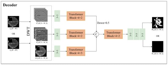 The watermark embedding network proposed is shown in Figure 4. The input DWI image is subjected to a two-level discrete wavelet transform to obtain its corresponding wavelet frequency information. The frequency information in the horizontal direction (), vertical direction (), and diagonal direction () obtained from the first-level wavelet decomposition are combined to represent . Similarly, the frequency information in the horizontal direction (), vertical direction (), and diagonal direction () obtained from the second-level wavelet decomposition are combined to represent , and the low-frequency part of the second-level wavelet decomposition is represented as . To avoid damaging the texture details and fibre direction of the DWI image, the information in the three frequency bands of , , and is separately input into three network branches for reconstruction.