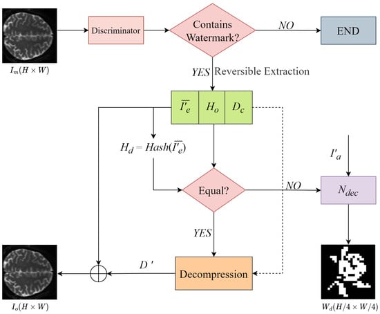 The process of image restoration is shown in the Figure 11. First, the discriminator is used to determine if the marked image contains watermark information. If contains watermark information, the same reversible watermarking method is used to extract , , , and calculate the hash value of . Then, by comparing with , we can verify the integrity of . If and are equal, we assume has not been attacked during transmission. We can then use inverse compression to obtain from , and add to to restore the cover image . Otherwise, if is not equal to , it indicates that the image has been attacked during transmission, and the restoration information is permanently lost. In this case, we can directly use the watermark extraction network to extract the watermark from the attacked image for copyright verification.