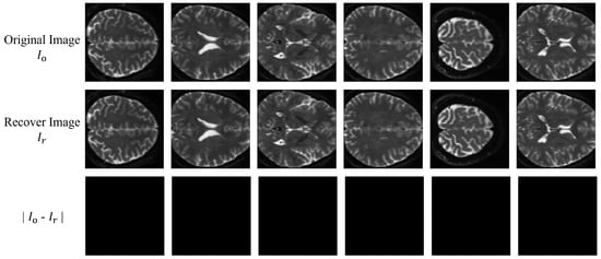 Table 2 shows the average BER values of the extracted watermark and the average PSNR values of the recovered image and the cover image for 64 slice images under the no-attack condition. Figure 12 displays the visual results of the differences between six slice images and their corresponding recovered images. It can be seen that the average BER value of our proposed algorithm is 0, and the average PSNR value is 1, indicating that our proposed algorithm can extract the watermark information and recover the cover image losslessly under no attack.