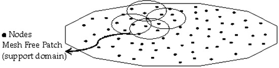 Due to its completeness and continuity [37], the moving least squares (MLS) approach can successfully interpolate data with reasonable accuracy. The MLS approach provides the displacement or stress estimate at a node via the interpolation of the displacement or stress in a weighted least-squares sense at the mesh-free local domains. The nodes can be expressed in 2-D as x1–xn, where x1 = (x1,y1). The displacement (or stress) estimate uh(x) can be expressed as the product of the polynomial basis, P(x), and a coefficients vector, a(x).