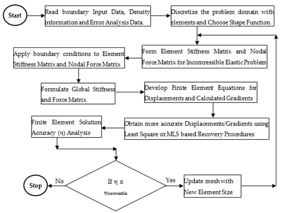 The mesh-free MLS-based recovery estimation and mesh-improvement strategies were employed in two-dimensional FEM-based computer program. The mesh-dependent patch-based conventional error-recovery estimations and incompressible elastic formulation were also implemented. The program was run on i7-configuration computer with processor of 2.6 GHz and RAM of 16 GB to obtain the computational results. Flow chart for MLS-based recovery technique coupled with adaptive analysis of incompressible elastic problems is shown in Figure 2.