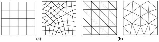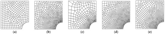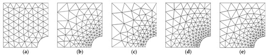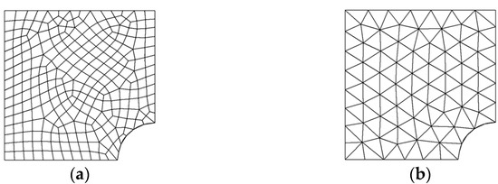 The meshes generated using triangular and quadrilateral elements are shown in Figure 3. The plate problem was analyzed considering one-point reduced integration with quadrilateral elements (four-node) and two-point reduced integration with triangular elements (six-node) for volumetric strain term. The desired error limit for four-node quadrilateral and six-node triangular elements was kept as 2%. The finite-element-analysis results for convergence rate and effectivity of solution with different error-recovery approaches in energy norms considering meshfree patches and mesh-dependent patches are tabulated in Table 1, Table 2, Table 3 and Table 4. The updated mesh plots for desired accuracy of 2% with various recovery procedures and meshing schemes is given in Figure 4 and Figure 5. The element numbers (N) and degrees of freedom (DOF) after mesh update for desired accuracy of 2% in adaptive analysis with displacement/stress-error-recovery techniques for quadrilateral/triangular discretization are presented in Table 5.