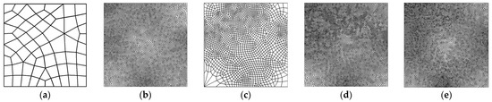 Updated meshes of incompressible plate with displacement/stress-recovery techniques considering mesh-free (MF) and mesh-dependent (MD) patches (quadrilateral with initial mesh = 64, 2% desirable accuracy). (a) Mesh (initial); (b) disp. recovery (MF); (c) stress recovery (MF); (d) disp. recovery (MD); (e) stress recovery (MD).