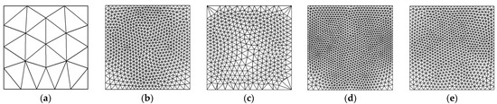 Updated meshes of incompressible plate with displacement/stress-recovery techniques considering mesh-free (MF) and mesh-dependent (MD) patches (triangular elements in initial mesh = 28, 2% desirable accuracy). (a) Mesh (initial); (b) disp. recovery (MF); (c) stress recovery (MF); (d) disp. recovery (MD); (e) stress recovery (MD).