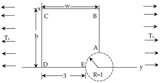 The problem domain is defined by radius (R) = 1 unit, sided (w,b) = 4 unit, as shown in Figure 6. The rigid inclusion center is a singular point. The arc AE boundary has both x- and y-displacement as zero. The lines of the CB and DE boundary have zero shear stress and normal displacement components. The tractions computed from Equations (28)–(30) are imposed along the boundaries of AB and CD. The corresponding load vectors were computed by numerical quadrature using twelve Gauss points per element side. The plate problem was analyzed using quadrilateral elements with one-point reduced integration and six-node triangular elements with two-point reduced integration for the volumetric strain term (Figure 7). The desired accuracy in the energy norms for the four-node and six-node elements was kept as 1%. The computational results for the convergence rates and the effectivity for the different error-recovery techniques for the mesh-free patch and standard patch are presented in Table 7 and Table 8. The updated mesh plots for the desired accuracy of 1% with various recovery procedures and meshing schemes are shown in Figure 8 and Figure 9. The degrees of freedom and element numbers (N) after the mesh improvement to ensure the desired accuracy of 1% using displacement/stress-recovery techniques and quadrilateral/triangular mesh in the adaptive analysis of the incompressible plate with rigid inclusion are presented in Table 8.