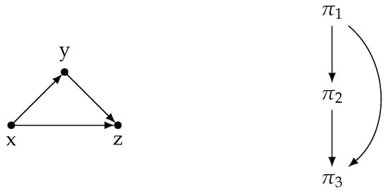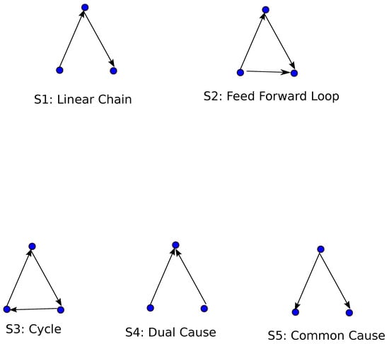 Higher-order patterns (i.e., ) can in principle be studied, but such a task becomes prohibitively difficult in practical cases. There are 199 possible 4-node subgraphs, 9364 5-node subgraphs and so on ([65]). Moreover, to count the number of a specific 4-node subgraph occurrences in a graph of 1600 nodes, the combinations of nodes should be checked. This is a number on the order of , i.e., the computational task quickly becomes unfeasible. Thus, the vast majority of research is conducted considering the existence of three-node motifs and has been proven a rather fruitful, especially in biological networks ([64,66,67,68,69,70,71]).
