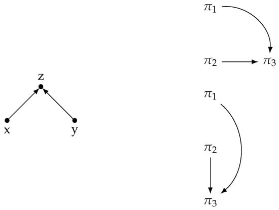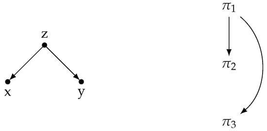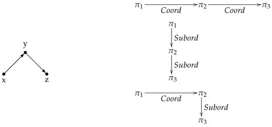 Between the five possible three-node subgraphs in Figure 5, is excluded, since discourse structure graphs are not allowed to include loops that could relate a node back to itself. Naturally, discourse advancement forbids this type of subgraph and, thus, is excluded from our analysis (although it is not analyzed, we included it in the graphs in Section 5 and in Table A2 with the mean pattern values; see the discussion below). Before responding to the question of whether discourse graphs are characterized by one or more network motifs or antimotifs in Section 5, it is important to realize the types of discourse subgraphs that are mapped to the different network subgraphs. Notice that Figure 6, Figure 7, Figure 8 and Figure 9 include only the corresponding discourse graphs that respect the Right Frontier Constraint (RFC) and not all possible three-node subgraphs that may satisfy the definition of the network subgraph patterns. However, for our purposes, the distinction between coordinating and subordinating discourse relations does not affect the results of our study (however, see [72] for certain types of RFC violations related to this distinction).