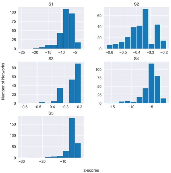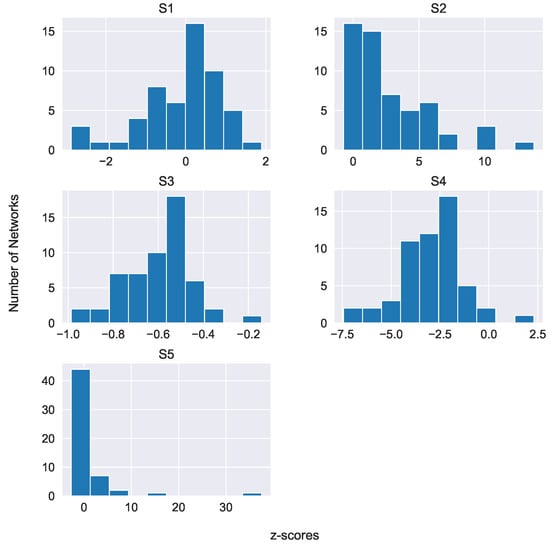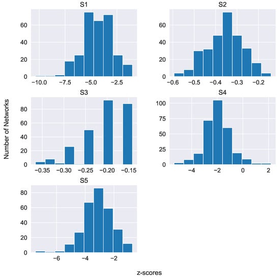 The most famous nontrivial quantity of interest characterizing directed networks is the existence or absence of network motifs ([50,64]). The basic premise behind network motifs is that networks are made of repeating occurrences of simple patterns. Thus, a network is scanned for specific n-node subgraphs (here ). We refer to these three-node subgraphs as patterns and denote them with the letter S, followed by an index number; see Figure 5. The number of occurrences of these patterns in a graph is compared with the number of subgraphs found in appropriately randomized networks, and z-scores are calculated so that one can estimate how likely a particular subgraph is to appear by chance. Z-scores higher than 2 indicate that a particular pattern is frequently present in the actual network, and it is unlikely that this is due to pure chance, since it is infrequent in the randomized graphs. Such a pattern is then termed a network motif. It is equally important to locate patterns that are missing from the original network while they appear in the randomized graphs. Such an absence would indicate that there is a mechanism prohibiting their appearance. We identify them when their associated z-score is less than . Such patterns are termed antimotifs, i.e., patterns that are rarer than at random, and may be equally important for revealing aspects of the discourse structure. Thus, we must emphasize the difference between a pattern and a motif. For a pattern to be termed a network motif, it is required that it appears much more often or rarely than it would, on average, appear in random networks.