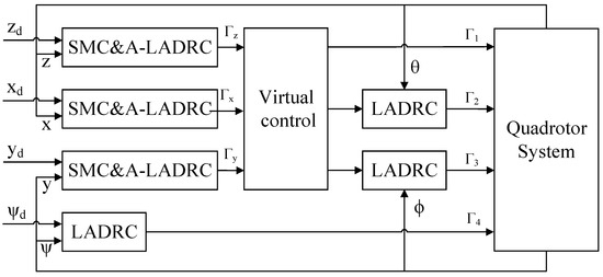 24], an improved LADRC controller was proposed to improve the dynamic capability of the distribution network under various grid defect scenarios. In summary, conventional control methods are subject to internal uncertainties, unmodeled parts, and external nonlinear disturbances that can lead to poor control performance and make it difficult to design controllers due to the complexity of the quadrotor itself. In addition to their own shortcomings, the control methods described above cannot simultaneously take into account internal parameter uncertainties by coupling between quadrotor control channels, wind disturbances, and other nonlinear disturbances, and can only deal with one or two disturbances; thus, further research is needed.