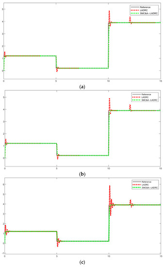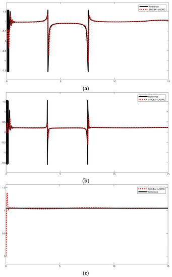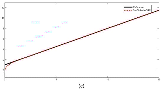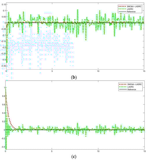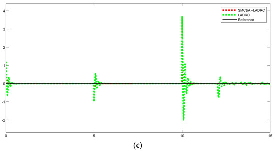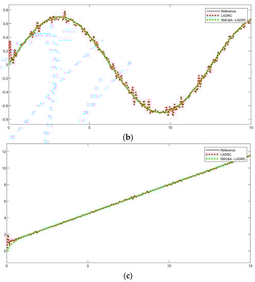 Figure 6a–c, respectively, and it can be seen that the control strategy proposed in this paper can be quickly to the input signal, which proves that the SMC&A-LADRC control scheme is reasonable and effective.