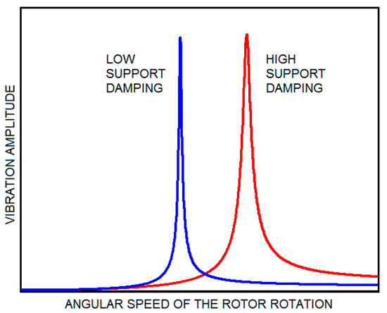 The second possibility is offered by controlling the damping effect in the rotor supports. Higher damping shifts the resonance peak to higher angular velocities, as evident from the frequency responses depicted in Figure 1. To minimize the vibration amplitude of accelerating or decelerating rotors, damping in the support elements should be maximum for low velocities and as low as possible for higher angular speeds. Changing the damping at the moment when the angular velocity corresponds to the point of intersection of the frequency responses related to the low and high damping leads to the minimum vibration amplitude during running the rotor through the area of the critical speed.