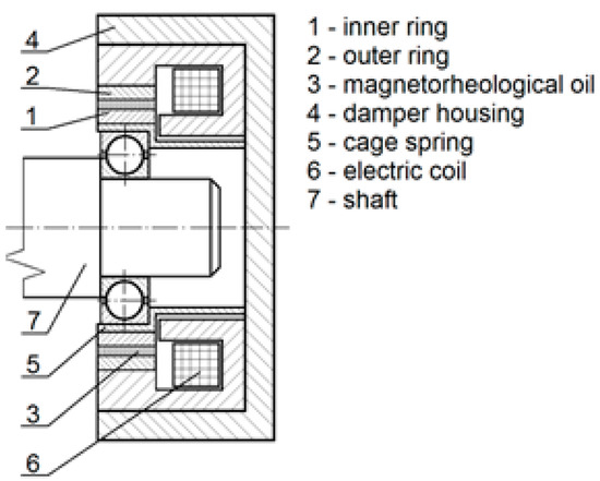 The radial magnetorheological damper (Figure 2) is a controllable damping element used for vibration attenuation of rotors. The damper consists of an inner and outer ring. The latter is fixed to the stationary part. The rotor journal is supported by a rolling element bearing inserted in the inner damper ring, which is coupled with the damper housing by a cage spring of a cylindrical form. The narrow gap between the rings is filled with a thin layer of magnetorheological oil. The stationary part is equipped with an electric coil that generates magnetic flux, passing through the damper body, a thin layer of the magnetorheological oil, and the inner damper ring that returns to the coil.