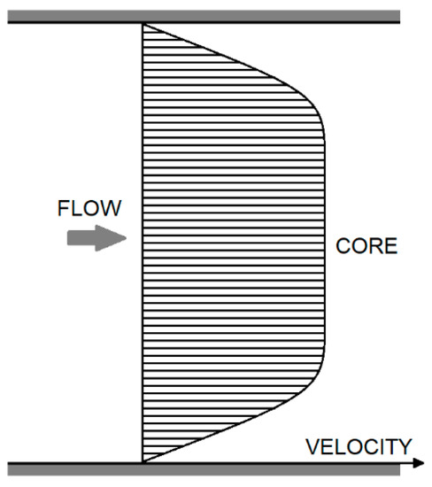 The action of magnetic flux on the magnetorheological oil changes its character from a Newtonian-like liquid (no magnetic field) to a liquid with a yielding shear stress (presence of the magnetic field), the magnitude of which depends on magnetic induction of the magnetic field. In areas where the flow rate is low, the shear stress between two neighboring layers drops below the yielding shear stress and forms a core where the magnetorheological material behaves more similar to solid matter than liquid matter (But, the velocities of two neighboring layers are the same.). The velocity profile of the activated magnetorheological liquid flowing in a narrow gap or channel can be seen in Figure 3. The core is formed in the middle of the flow. Squeezing the oil film between the inner and outer damper rings because of the rotor vibration and magnitude of the yielding shear stress are the most significant factors that influence the damping effect.