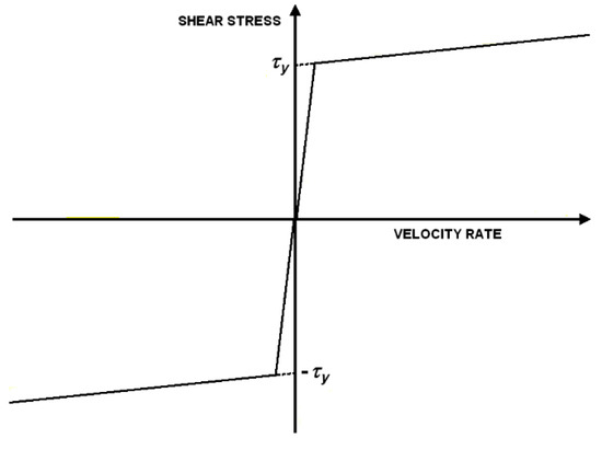 The developed mathematical model of the squeeze film damper is based on the classical theory of lubrication [37,38], except the assumption for the lubricant. If the oil is not affected by a magnetic field, the lubricant is considered to be Newtonian liquid. If affected by a magnetic field, the oil is represented by bilinear (biviscous) material. Its flow curve is depicted in Figure 4. In addition, it is assumed that the geometric and design parameters make it possible to consider the damper as short and symmetric relative to the damper middle plane, which is perpendicular to the damper axis. In the area where the width of the clearance between the rings rises because of the rotor vibration, the air is sucked in the damper from the neighborhood, and cavitation takes place there. Pressure in the cavitated regions is assumed to be constant and equal to the atmospheric one.