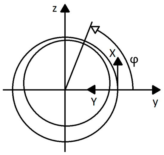 Fmry, Fmrz are the y (horizontal) and z (vertical) components of the magnetorheological hydraulic force acting on the rotor journal, RD is the radius of the damper gap, LD is the damper length, and φ is the circumferential coordinate (Figure 5).