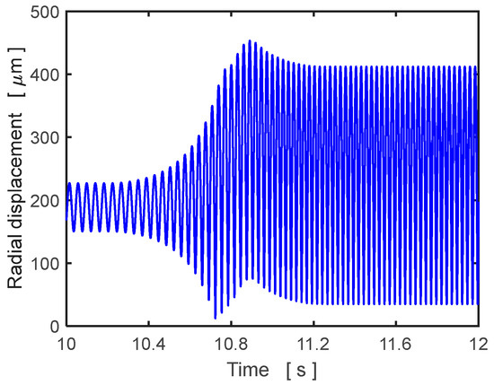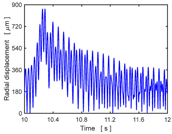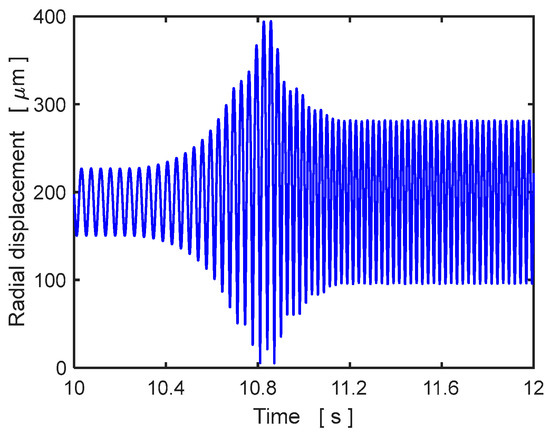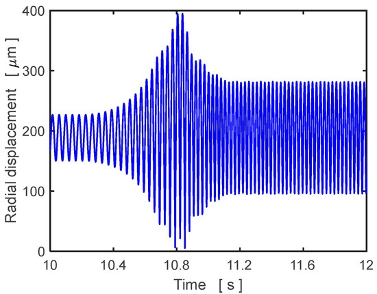 The same analysis was performed for the arbitrary chosen phase shift of 1/2 × π rad (90°). The rotor acceleration started at the point of time of 10.225 s, when the horizontal and vertical displacements of the disc center were equal to the reference values (−19.11 and −156.09 μm, respectively). The current decrease started at the point of time of 10.4875 s, when the angular speed of the rotor rotation reached the reference value of 170.2 rad/s and lasted for the reference period of 0.6375 s. The resulting time history of the radial displacement of the disc is depicted in Figure 17. The maximum displacement is 394 μm, which corresponds very well to the maximum radial displacement of the operation regime with the phase shift of the excitation effect of 5/3 × π rad (300°).