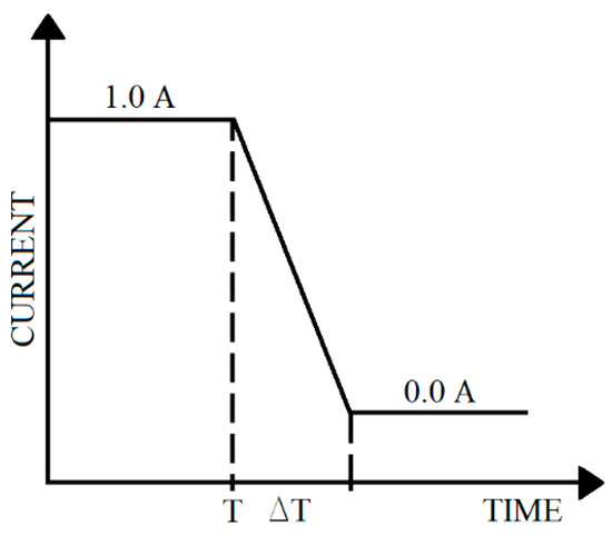 The results of the computational simulations supported by the theoretical pieces of knowledge and previous investigations show that, to reduce amplitude of the rotor oscillation during its running up, the current decrease must not be sudden, but it must be distributed in a certain time interval. Therefore, a linear drop in the current from 1.0 to 0.0 A was tested (Figure 12). T and ΔT denote the moment of time of starting and the time of duration of the current decrease, respectively.