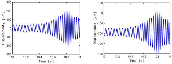 Figure 16 shows the time histories of displacements of the disc center in the horizontal and vertical directions referred to the case (reference case) when the maximum vibration amplitude of 394 μm is minimum from all investigated cases (Table 2). The corresponding phase shift of the excitation effect is 5/3 × π rad (300°). The reference values of the displacements in the horizontal and vertical directions, the reference value of the angular speed of the rotor rotation, and duration of the current decrease are −19.11 μm, −156.09 μm, 170.2 rad/s, and 0.6375 s, respectively.