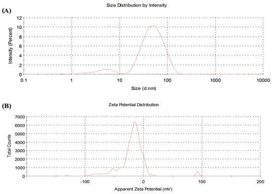The SN-SV with reddish color were obtained. The reduction of AgNO3 to SN-SV was completed after 12 h at 25 ± 6 °C due to SV acting as a reducing agent for SN-SV. The diameter of SN-SV (Figure 1A) was recorded as 37.32 ± 1.686 nm. Furthermore, the obtained ζ-potentials of formulated SN-SV were recorded as a negative charge of approximately −15.4 ± 0.72 mV (Figure 1B). The PDI value was recorded as ≈ 0.121, confirming the preparation of a stabilized nanosystem for SN-SV.