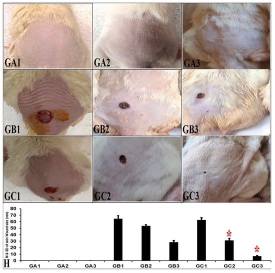 Skin photographs from all rat subgroups, showing the mean skin wound size on days 5, 11, and 15. Histogram (H) presents all subgroups’ mean ± SD of the skin wound size. GB2 and GB3 vs. GC2 and GC3 reveal a significant difference (* p ≤ 0.5).