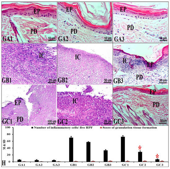 Photographs from the skin sections of all rat subgroups, showing the parameters of skin wound healing (the inflammatory cells (IC) and the granulation tissue formation) on days 5, 11, and 15. GA1, 2, and 3 show normal skin epidermis (EP) and papillary dermis (PD) layers. Obvious improvement of the skin wound healing signs (minimal inflammation and better granulation tissue) is noticed in the GC2 and GC3 subgroups compared to the GB2 and GB3 subgroups. The histogram (H) presents the mean ± SD of the IC numbers and the scores of granulation tissue formation in all subgroups. *: GB2 and GB3 vs. GC2 and GC3 reveal significant differences (p ≤ 0.05).