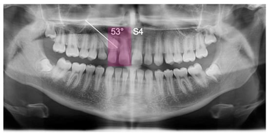 The panoramic X-ray showed unilateral permanent canine displacement in sector four with an alpha angle of more than 53° degrees according to the Ericson and Kurol classification (Figure 2).