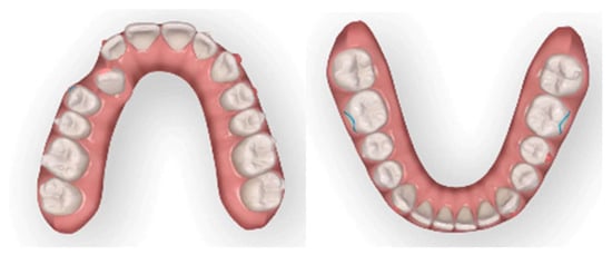 - Simon, M.; Keilig, L.; Schwarze, J.; Jung, B.A.; Bourauel, C. Treatment outcome and efficacy of an aligner technique—Regarding incisor torque, premolar derotation and molar distalization. BMC Oral Health 2014, 14, 68. [Google Scholar] [CrossRef]