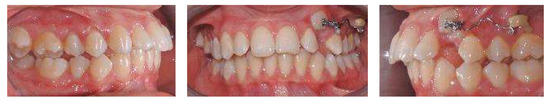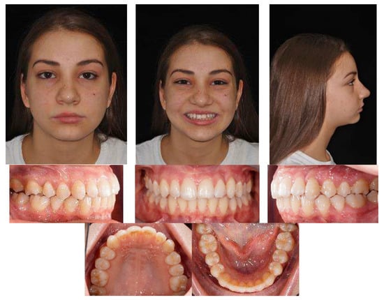 Post-treatment records of the patient successfully treated using a combination of cantilever mechanics with TADs and clear aligners show a control of the facial aesthetics from the frontal and lateral perspectives with a harmonious soft-tissue profile. Final clinical records show good aesthetics and the functional recovery of the upper canines in the arch. A Class I canine relationship was achieved, and overbite and overjet were normalized. The correction of crowding was carried out (Figure 17).