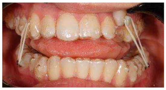 At the same time, the canine was linked to the button cutout of 36 teeth by using Class II elastics to extrude and tip it. On the right side, Class II elastics were placed in order to improve the dental Class II malocclusion (Figure 14 and Figure 15)