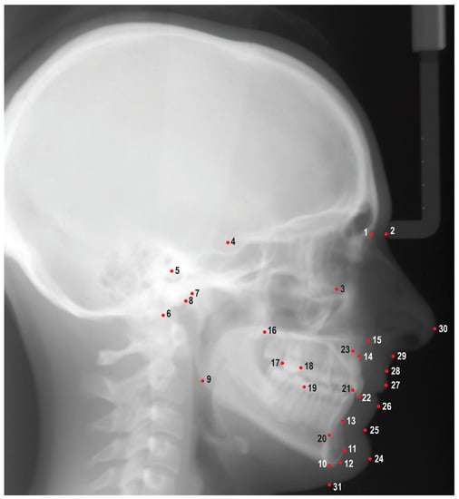 Cephalometric landmarks used in this study. 1: Nasion, 2: soft tissue nasion, 3: orbitale, 4: sella, 5: porion, 6: basion, 7: condylion, 8: articulare, 9: gonion, 10: menton, 11: pogonion, 12: gnathion, 13: B point, 14: A point, 15: anterior nasal spine, 16: posterior nasal spine, 17: distal of upper first molar, 18: mesial of upper first molar, 19: mesial of lower first molar, 20: lower incisor root apex, 21: lower incisor incisal edge, 22: upper incisor incisal edge, 23: upper incisor root apex, 24: soft tissue pogonion, 25: soft tissue B point, 26: lower lip, 27: upper lip, 28: soft tissue A point, 29: subnasale, 30: pronasale, 31: soft tissue menton.