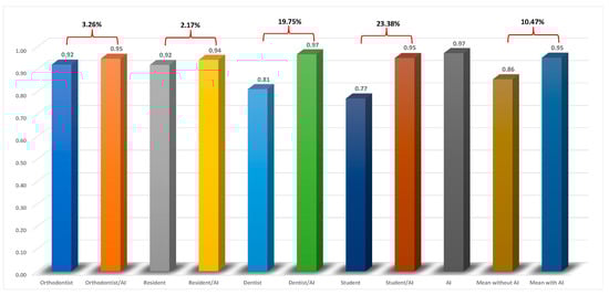 Table 1 shows the ICCs of the cephalometric measurements for each group. Mean ICC values were also calculated for all groups of examiners by averaging the individual cephalometric measurement ICC values. According to the results, AI showed excellent precision (ICCs > 0.90). The precision of the examiners without the aid of AI generally followed their level of experience and exposure to the cephalometric analyses. The orthodontist, resident, dentist, and dental student had a mean ICC of 0.92, 0.92, 0.81, and 0.77, respectively. With the aid of AI, the precision of the orthodontist, resident, dentist, and dental student improved by 3.26%, 2.17%, 19.75%, and 23.38%, respectively (Figure 2). Overall, the precision of the examiners improved by 10.47% with the aid of AI. As we expected, the least experienced clinicians benefitted the most from the help of AI.