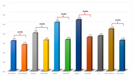 To compare each examiner’s overall accuracy with and without AI’s aid, an average of the MAEs was calculated for each group (Table 3). The average MAE of CEFBOT was 1.83 (in mm/°), which was within the clinically acceptable range (MAEs < 2 mm/°). The examiners’ accuracy without AI generally followed their level of experience and exposure to the cephalometric analyses. The orthodontist and resident both had MAEs within the clinically acceptable range (1.57 and 1.99 mm/°, respectively) while the accuracy of the dentist and dental student were out of the range, with MAEs of 2.55 and 2.68 mm/°, respectively. With the aid of AI, the accuracy of the orthodontist, resident, dentist, and dental student improved by 12.74%, 19.10%, 35.69%, and 33.96%, respectively (Figure 3). The AI/human augmentation method revealed clinically acceptable accuracies for all of the examiner groups. Although the examiners’ accuracy improved by 27.27% with the aid of AI, the least experienced clinicians benefitted the most from the AI/human augmentation method of cephalometric landmark identification.