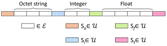 Another possibility is to identify the data types of the various parameters employing sequences from the set (Figure 5): for example, it is possible to use a use sequence to identify an integer, another sequence to specify a float, then to specify an octet string, to express a binary pointer, and two sequences to indicate the beginning and the end of a record made of fields in turn identified with these delimiters (with a possible recursive structure). The parameter’s list can be terminated with the sequence from the same set . In this case, the framework is instantiated with .