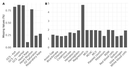 The experiments involve the selection of features from the MIMIC-IV dataset that are typically available in each ICU admission. Table 1 summarizes all the features considered in the experiments, categorized into demographics, administrative, vital signs, and laboratory parameters. Demographic data include age and gender, neither of which are likely to change during hospitalization. Administrative data provide the LOS necessary for prediction as a ground truth label for each ICU stay. These data also comprise diagnoses, first care unit, admission type, and admission location, which can be viewed as structural representations of patient status specific to each hospital admission. Vital signs and laboratory parameters were measured several times during each ICU stay. We collected measurements within the first 24 h of ICU admission with the goal of developing a practical approach to classify (predict) ICU stays early after admission, while retaining data necessary for prediction. In addition, we only considered vital signs (laboratory parameters) with a completeness greater than 99% (95%) of all ICU stays, which means that, for instance, blood pressure is no longer included due to its high missing rate in the MIMIC-IV data. This ensures that fewer data are excluded due to missing values, as shown in Figure 1 for vital signs (A) and laboratory parameters (B). However, despite a high rate of missing values, the body temperature is still included here as an important vital sign [40].