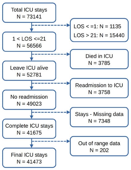 As a result, the vital signs include heart rate, O saturation pulse oxymetry, respiratory rate, body temperature, Glasgow Coma Scale (GCS) ocular response (eye), oral response (verbal), and motor response (motor). The selected laboratory parameters also include the anion gap, bicarbonate, chloride, creatinine, glucose, sodium, magnesium, potassium, phosphate, urea nitrogen, hematocrit, hemoglobin, mean corpuscular hemoglobin (MCH), mean corpuscular hemoglobin concentration (MCHC), mean corpuscular volume (MCV), red cell distribution width (RDW), red blood cells, white blood cells, and platelet count. All patients with at least one ICU visit are included in the cohort. Among ICU patients, we only select adults older than 18 years. In addition, we exclude patients with an LOS greater than 21 days to avoid extremely long stays, and less than one day since we consider data collected in the first 24 h for modeling. We also exclude patients who died during their stay in the ICU or who returned to the ICU within 48 h after being discharged from the ICU. To ensure the completeness of the selected data, we only consider ICU stays that have all the features required for the analysis, i.e., complete data. We finally specify a feasible range for each feature and exclude the extreme outliers outside this range to avoid, for instance, invalid negative values for heart rate. The flowchart in Figure 2 summarizes the sequential steps for selecting data that meet these conditions, with the size of the dataset indicated at each step.
