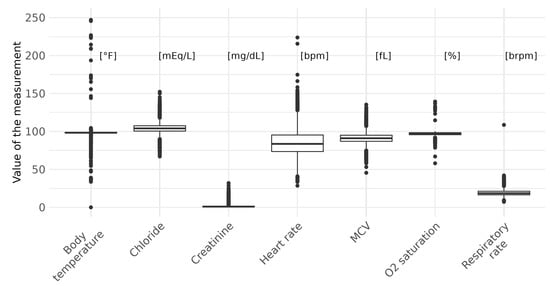 Distribution (box plot) of several selected features, namely body temperature, chloride, creatinine, heart rate, MCV, O2 saturation, and respiratory rate before data cleaning. The box plots show the wide range of variation for few features, with some extreme outliers not shown for visualization purposes (e.g., for body temperature).