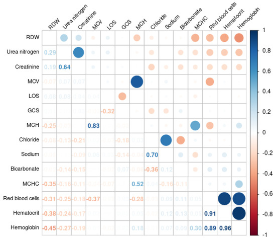 To explore the influence of features on LOS, we compute the correlation matrix of all features and LOS shown in Figure 4. The GCS has the highest correlation with LOS at . The negative correlation means that the longer the LOS, the lower the GCS (3–15), because a higher score means that the patient is less comatose. However, the matrix shows that LOS is not strongly correlated with any single feature. Other features that are slightly correlated with LOS are temperature with 0.14 or respiratory rate with 0.13. Among the features, strong correlations are observed between sodium and chloride (0.70), creatinine and urea nitrogen (0.64), hematocrit and hemoglobin (0.96), hematocrit and red blood cells (0.81), and MCH and MCV (0.83). Such correlations reflect the underlying measurement parameters or the context of the biological system. For example, the calculation of MCH requires the amount of hemoglobin and the amount of red blood cells.