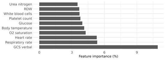 In XGBoost, a feature importance matrix can be exported to give further insight into the influence of different features on the prediction performance. The visualization of the top 10 (important) features is shown in Figure 5. The GCS verbal has the highest importance for performance, consistent with its strong correlation with LOS (Figure 4). Vital signs ranked next, which were less than half as important as the GCS verbal, with no notable correlation with LOS. Laboratory measurements are placed in the last position, with glucose, platelets, and white blood cells at the top, while the remaining measurements are of decreasing importance to the model.