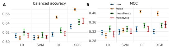 Evaluation of different classifiers (logistic regression, SVM, random forest, XGBoost) in terms of (A) balanced accuracy and (B) MCC, where temporal features are represented by different measures including mean, maximum, mean and maximum, and mean and the standard deviation. The points and error bars indicate the mean and standard deviation of the results from 10 different experiments using repeated random train/test split.