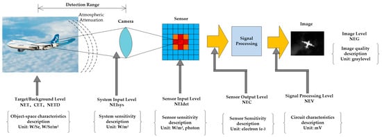 The sensitivity of the AVD system can be described by a series of noise equivalent sensitivity coefficients. The noise equivalent sensitivity coefficient is the smallest noise step that one system can distinguish, and it is represented at various positions along the imaging chain [31]. System sensitivity generally refers to the ability of the system to detect targets, and is usually defined as the change in radiation power when the output of the system is 1. As shown in Figure 2, at the target and background level we have noise equivalent target radiant intensity (), clutter equivalent radiant intensity () and noise equivalent temperature difference (NEDT); at the aperture through atmosphere transmission, there is system-level noise equivalent irradiance (NEIsys); at the surface of the focal plane, there is a detector-level noise equivalent irradiance (NEIdet); after the electro-optical conversion, there is noise equivalent charge (); at the signal processing level, there is noise equivalent voltage (NEV); and finally, at the image level, we have noise-equivalent gray-scale (NEG). In this paper, two levels of noise equivalent sensitivity coefficients are highlighted, which are and , and .